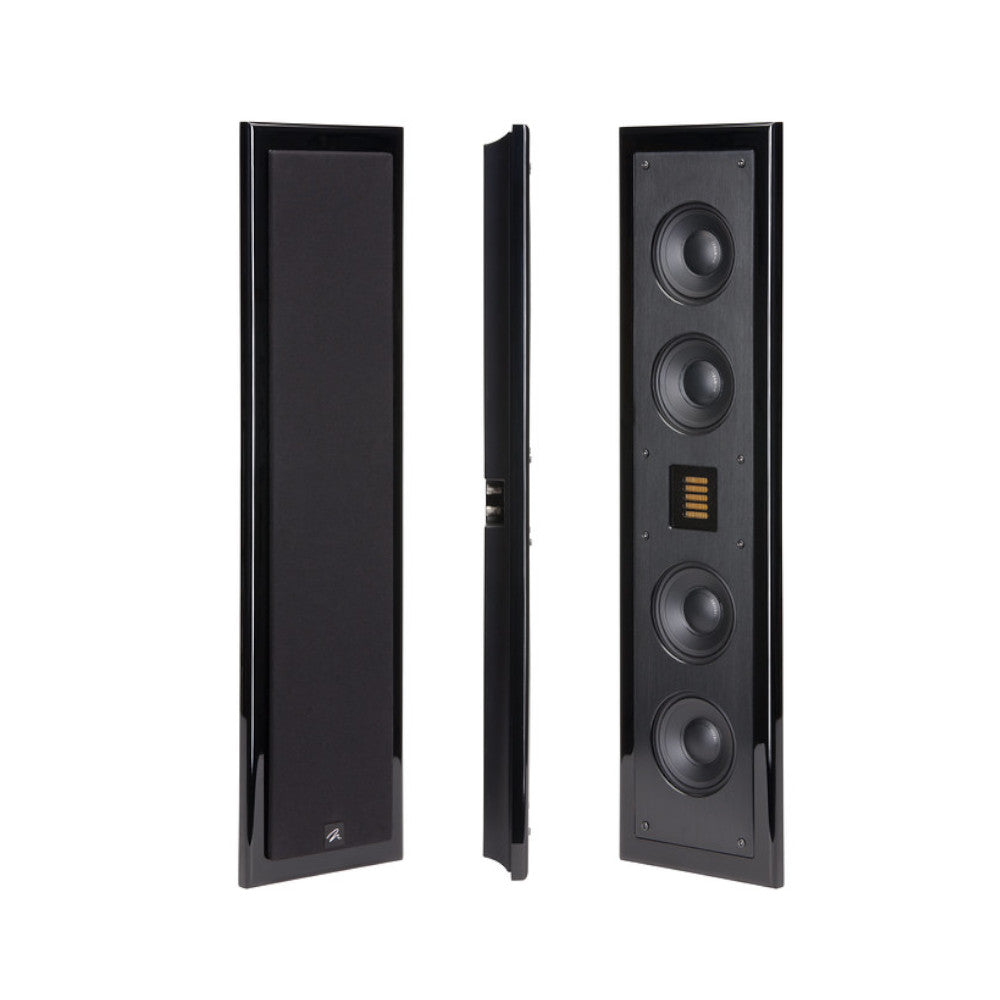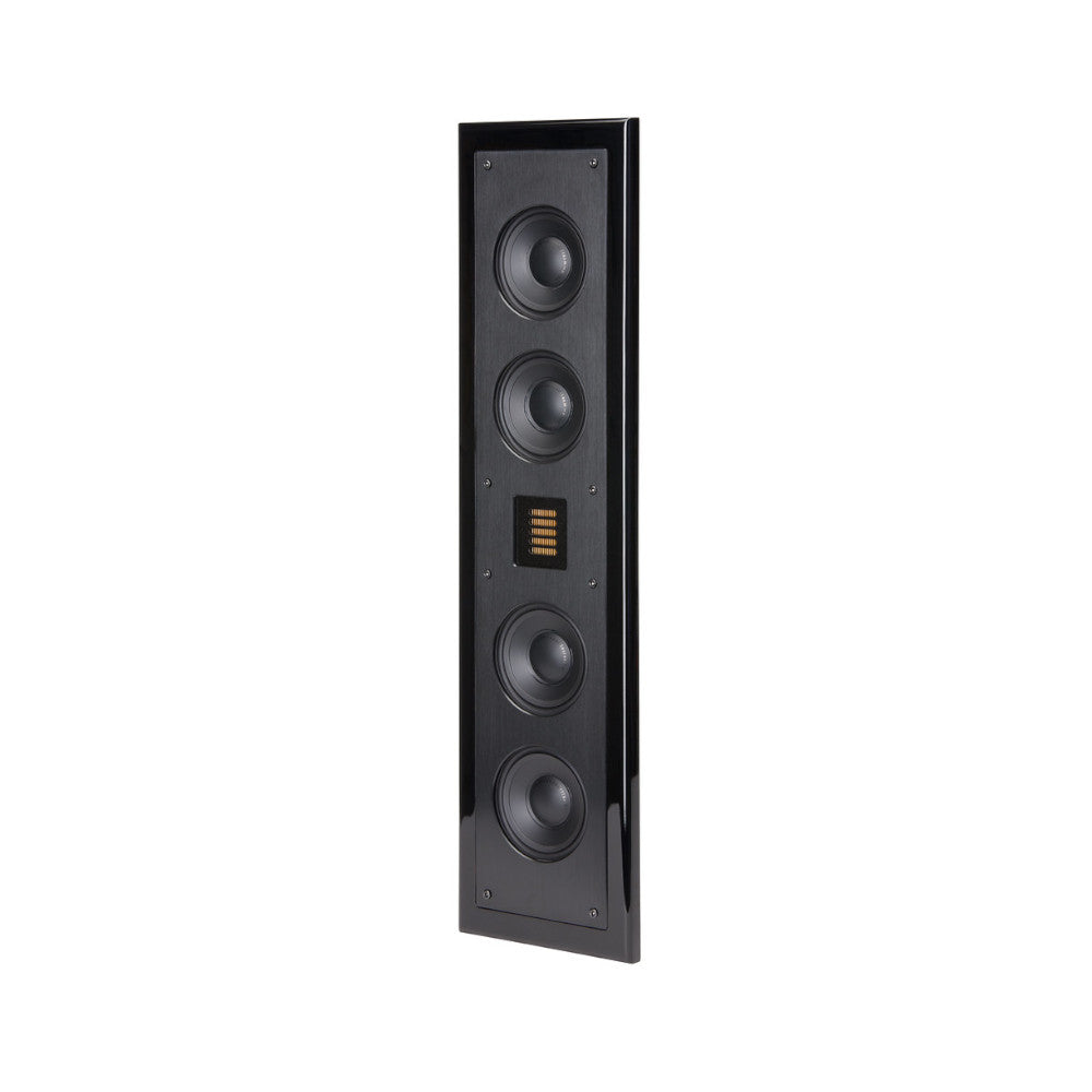 The secret to the Motion SLM's outstanding performance is the innovative dual 4", ultra-slim fiber cone woofers and dual 4" high-velocity passive bass radiators, paired with a Folded Motion tweeter to create stunning acoustical alchemy typically found in much larger speaker systems. Hidden discretely underneath the grille, the drivers are held securely in place by a solid, black-anodized brushed aluminium baffle. The high-gloss black SLM cabinet is only 1.45-inches thin, for a total wall protrusion of 1.83-inches with magnetic grille and included wall mount bracket