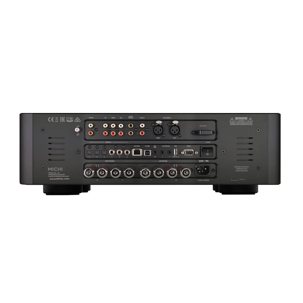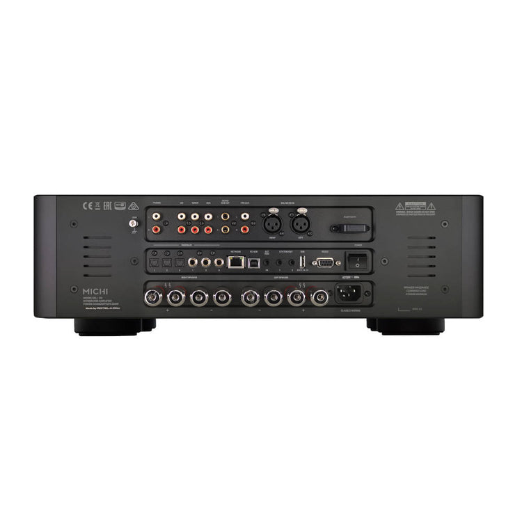 Operation and setup of the X3 Series 2 is done with ease utilising the included custom Michi IR remote, front panel controls and large graphic display. Dual Michi-engineered platinum plated speaker binding posts allow bi-wire and traditional speaker connections. A full size 1⁄4” (6.35mm) front panel headphone connection is available for private listening sessions. RS232 and Ethernet connections ensure simple connection with automation and control systems.