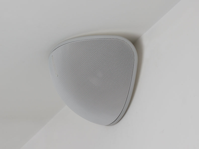 The curvy tapered back cabinet of Vecta speakers has been designed to be installed seamlessly under eaves or in the corner of a wall, creating a discreet and edgeless appearance. The speaker can be mounted horizontally or vertically when specified with the corner mount bracket - V-CORNER.