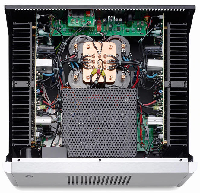 The RB-1582 MkII's high-end performance begins with an extremely large toroidal transformer combined with a total of 60,000µF storage capacity in special “slit foil” capacitors to provide completely stable power to the output stage. Slit foil capacitors have the ability to charge and discharge extremely quickly, thereby ensuring signal fidelity during orchestral crescendos or repetitive kick-drum impacts, for example. Both left and right channel construction are laid out in a mono block design (after the toroidal transformer) and all grounding is terminated in a star pattern on a copper grounding plate to ensure low signal to noise. The output stage is a discrete design that consists of 10 high current bipolar transistors per channel. Input options consist of both balanced XLR and unbalanced RCA connectors.