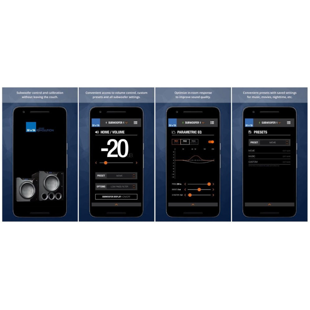 - Groundbreaking SVS Bluetooth DSP control app for iOS and Android devices with three user presets allow custom tuning for every room and system.
