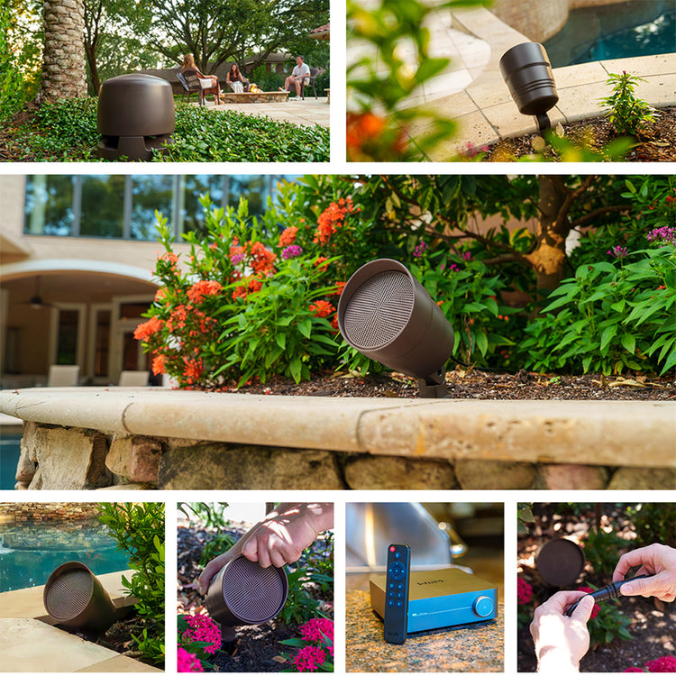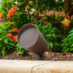 With Flexible Mounting Options – for Speakers & Subwoofer, the Speakers can be stake mounted in-ground, surface mounted or strapped onto a tree or pole whilst the Subwoofer can be stake mounted, surface mounted with feet or buried.